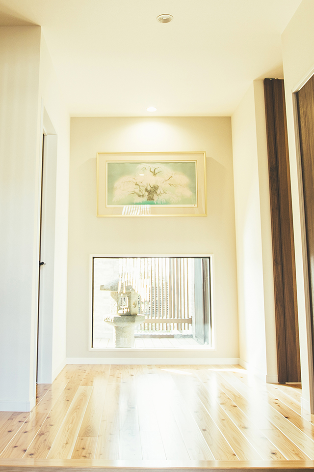 オール光セラ仕様の外壁で、新築時の姿が長持ちする「和モダン」の平屋の家。和を感じさせるアプローチの先にある玄関は長方形のタイルがアクセントに。 LDKは節ありの無垢床材を使用し、構造梁をそのまま見せることでモダンな中にも温かみを感じさせる空間に仕上げています。壁にはエコカラットを配し、豊富な収納スペースや小上がりの和室、風の通り道も考えた大きな明るい窓など工夫と暮らしやすさが沢山の住まいです。